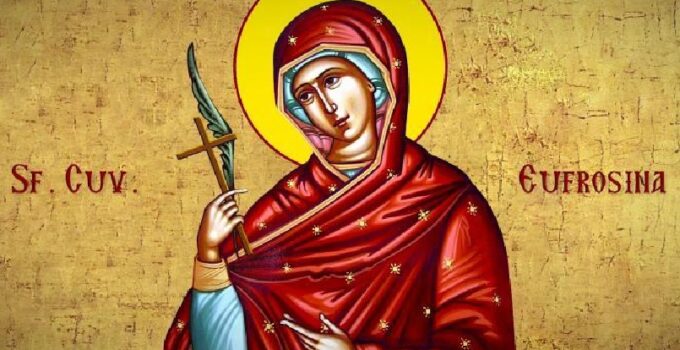 Sinaxar 25 Septembrie În aceasta luna, în ziua a douazeci si cincea, pomenirea Preacuvioasei Maicii noastre Eufrosina, fiica lui Pafnutie Egipteanul. Sfânta Eufrosina a trait pe timpul Împaratului Teodosie cel Mic. Parasind ea lucrurile veselitoare ale lumii si desertaciunea si slava...