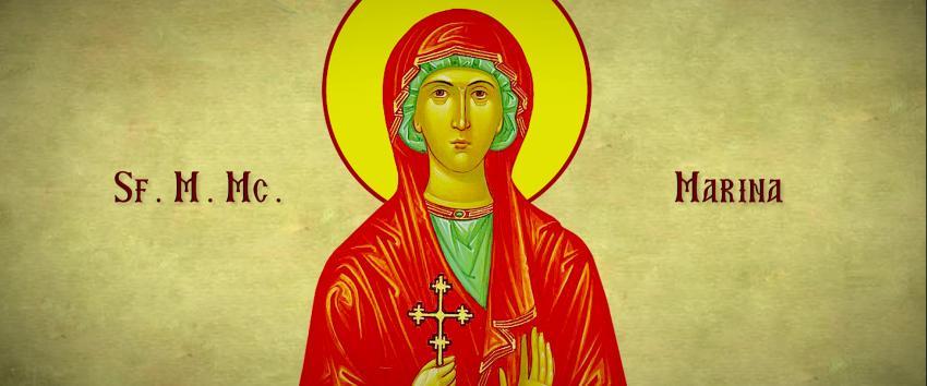 Sfînta Mare Muceniţă Marina s-a născut în Antiohia Pisidiei din părinţi de neam bun, dar nu binecredincioşi, fiind întunecaţi cu păgînătatea elinească. Tatăl ei, cu numele Edesie, era slujitor idolesc. După moartea mamei sale, rămînînd orfană şi în scutece, tatăl său a dat-o la o doică care petrecea într-un sat departe ca la 15 stadii de cetate. Copiliţa, fiind hrănită şi venind în vîrstă, s-a arătat a fi frumoasă cu trupul, dar mai frumoasă cu sufletul, pentru că era împodobită cu bună pricepere şi cu bun obicei. În vremea aceea, fiind mare prigoană împotriva creştinilor, preoţii şi clericii, învăţătorii cuvîntului lui Dumnezeu, se ascundeau de frica muncitorilor, unii prin pustietăţi, alţii prin munţi şi peşteri, iar alţii prin sate, printre oamenii cei proşti. Ei se tăinuiau în chip de săraci, dar unde puteau, învăţau sfînta credinţă în taină şi pe mulţi întorceau de la înşelăciunea idolească la creştinătate.